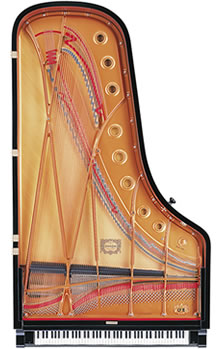 グランドピアノは、18世紀のはじめに発明された時から現在にいたるまで、基本的な形は変わっていません。つまりこの弦の張り方や響板の形状が、音響的に理想に近いものだからです。よってアップライトピアノに比べて、より力強い音、より繊細な音を表現することができます。さらに奥行きの長いものほど、響板面積が広くなり、弦も長く張れるので音が豊かに響きます。音楽ホールで使われるフルコンサートピアノの奥行きは、275cmにもなります。
